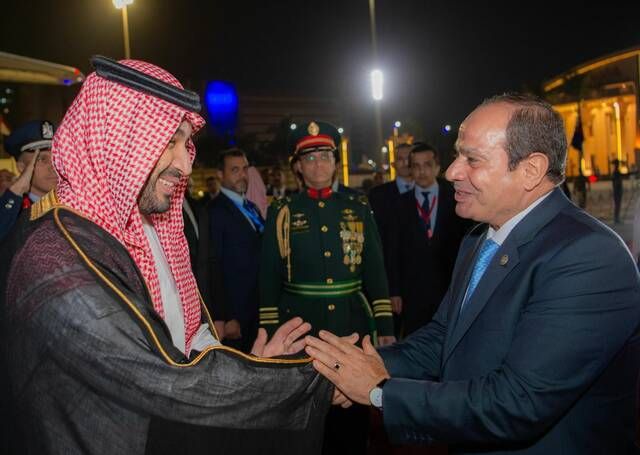 وأجرى الزعيمان لقاءً ثنائيًا، أعقبته جلسة مباحثات موسعة بحضور الدكتور مصطفى مدبولى رئيس مجلس الوزراء ووفدى البلدين، حيث رحب الرئيس بالأمير محمد بن سلمان، معربًا عن أطيب تحياته لأخيه الملك سلمان بن عبد العزيز، خادم الحرمين الشريفين.