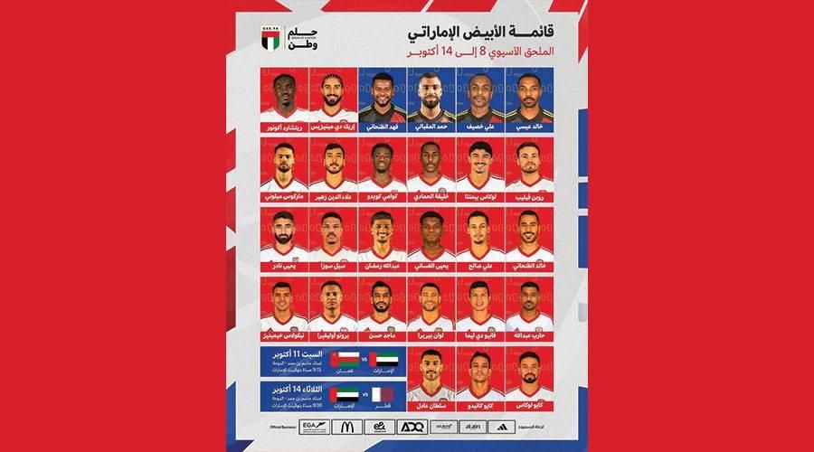 أعلن الجهاز الفني لمنتخب الإمارات الوطني الأول لكرة القدم، بقيادة الروماني أولاريو كوزمين، قائمة المنتخب المشاركة في الملحق المؤهل إلى نهائيات كأس العالم 2026، والمقرر أن يلتقي خلاله «الأبيض» مع نظيره العُماني يوم 11 أكتوبر الجاري، على أن يواجه منتخب قطر في 14 من الشهر نفسه.