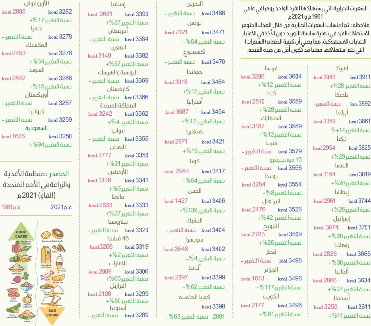 وبحسب البيانات فإن أغلب دول العالم ارتفع فيها استهلاك الفرد من السعرات الحرارية خلال الـ60 عاما الماضية غير أن نسبة الارتفاع كانت أعلى في بعض الدول أكثر من غيرها وعلى رأسها الصين 139%+، الجزائر 117%+، بوركينا فاسو 99%+، مينامار 97%+، خامسا السعودية ب 94%.